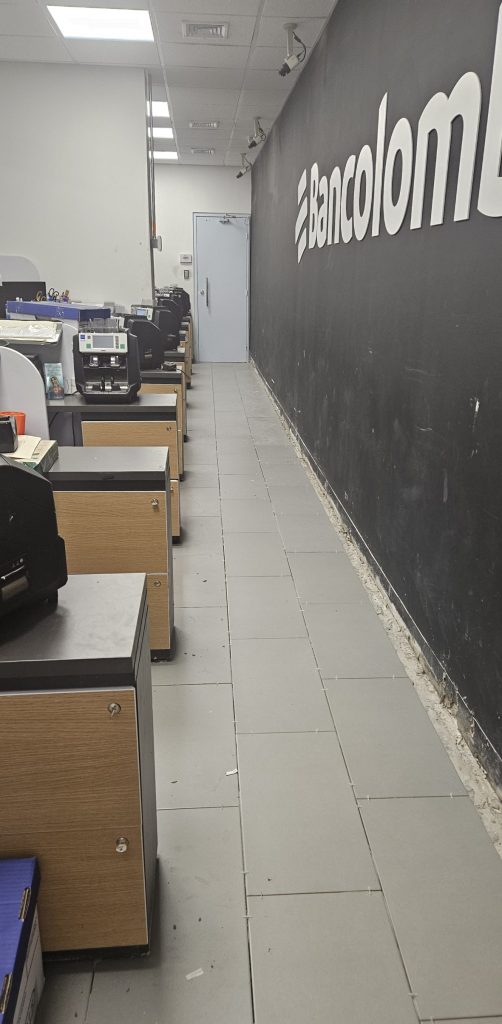 Cambio de Placa de Contrapiso y Piso en Oficina Sucursal de Bancolombia, Zona de Cajeros y Baños, Mantenimiento de Estuco y Pintura General.